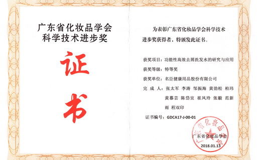 1月13日,廣東省化妝品學會化妝品科學技術進步獎勵大會在廣州國際生物島隆重舉行。名臣頭皮健康護理研究團隊完成的“功能性高效去屑洗發水的研究和應用”項目,經形式審查、專家評分、理事會表決等環節,從全省50多個申報項目中脫穎而出,獲得廣東省化妝品學會科技進步獎特等獎。