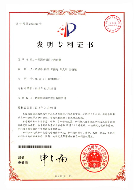 同期獲得國家知識(shí)產(chǎn)權(quán)局發(fā)明專利授權(quán)的還有公司研發(fā)創(chuàng)新新秀王彪工程師主導(dǎo)發(fā)明的“一種天然風(fēng)味的保健牙膏” (授權(quán)發(fā)明專利號(hào):CN201511004832.1)。