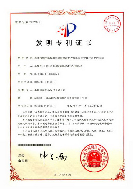 以葛華亭工程師為帶頭人的研發(fā)創(chuàng)新團(tuán)隊(duì)在口腔護(hù)理領(lǐng)域的創(chuàng)新成果先后獲得 “一種四味明目中藥牙膏”(授權(quán)發(fā)明專利號(hào):ZL201511004983.7)和“草本植物苧麻根和羊蹄根提取物在口腔護(hù)理產(chǎn)品中的應(yīng)用”(授權(quán)發(fā)明專利號(hào):ZL201511003856.5)等二項(xiàng)發(fā)明專利授權(quán)。這二項(xiàng)發(fā)明專利在傳統(tǒng)中醫(yī)藥成果的基礎(chǔ)上,將傳統(tǒng)優(yōu)秀技術(shù)成果與現(xiàn)代科學(xué)技術(shù)相結(jié)合,為消費(fèi)者提供更好的口腔護(hù)理保障。