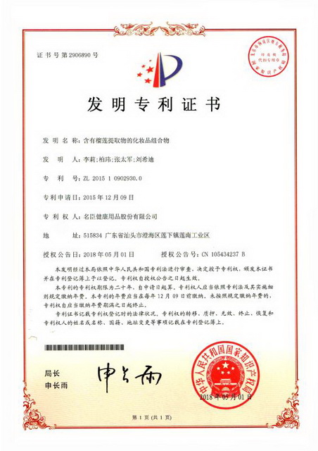 由名臣健康新生代優(yōu)秀工程師李莉?yàn)閹ь^人的創(chuàng)新團(tuán)隊(duì),創(chuàng)新成果“含有榴蓮提取物的化妝品組合物”(授權(quán)發(fā)明專利號(hào):ZL201510902930.0)獲得國家知識(shí)產(chǎn)權(quán)局發(fā)明專利授權(quán)。該成果從水果皇后榴蓮中發(fā)現(xiàn)可對(duì)減輕皮膚色素沉積、減輕皮膚氧化應(yīng)激和減少皮膚皺紋產(chǎn)生作用的成分,并經(jīng)科學(xué)篩選和驗(yàn)證,發(fā)明了一種對(duì)皮膚極其有益的化妝品組合物。
