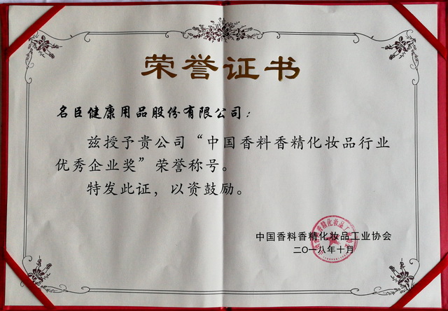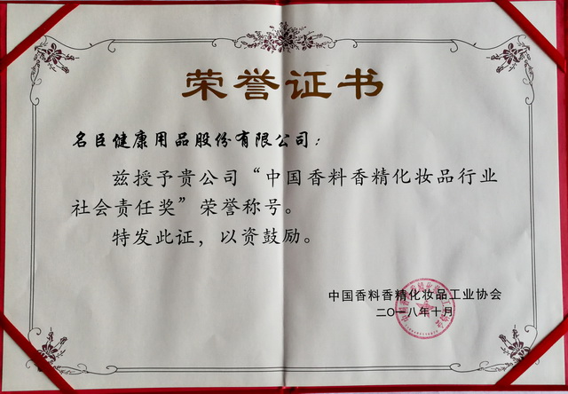名臣健康用品股份有限公司以其在品牌建設、研發創新、質量管理、扎實的企業管理、良好的經營業績,以及在回饋社會,關愛民生,善盡企業社會責任等方面所做的不懈努力和取得的成效,在本次年會上獲得“中國香料香精化妝品行業優秀企業獎”和“社會責任獎”二大獎項。