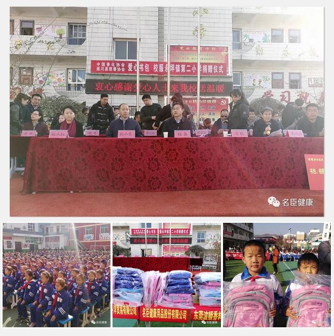 11月1日,名臣健康派出代表,遠(yuǎn)赴陜北革命老區(qū)延川縣參加中國香料香精化妝品工業(yè)協(xié)會組織的“走進(jìn)陜西-香化行業(yè)愛心書包校服公益活動”。為延川縣永坪鎮(zhèn)第二小學(xué)、東關(guān)小學(xué)、文安驛小學(xué)等學(xué)校和留守兒童管護中心捐贈愛心書包和愛心校服一批,以實際行動支持老區(qū)教育事業(yè),在這初冬時節(jié),為老區(qū)留守兒童奉獻(xiàn)拳拳愛心。