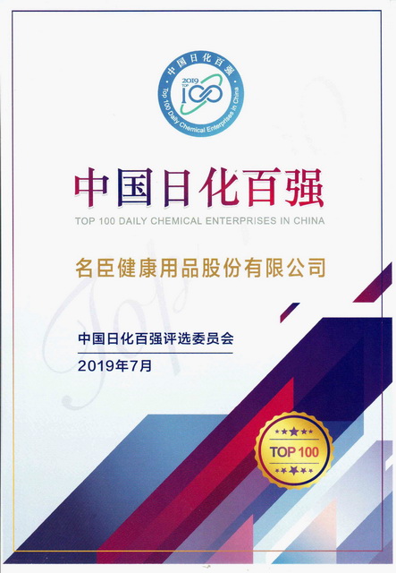 2019年是新中國成立70周年。建國以來,尤其是改革開放40年來,中國日化行業走過了從無到有、從小到大的發展歷程,取得了舉世矚目的輝煌成就。為彰顯新中國成立70年中國日化行業的非凡業績,中國日用化學工業研究院首次在中國日化全行業推出了“中國日化百強”評選活動,并于7月16日在廣州舉行“中國日化百強”頒獎儀式。名臣健康用品股份有限公司作為行業上市企業、國家高新技術企業,憑借其持續提升的企業研發創新能力、卓越的產品品質、品牌知名度和美譽度、企業綜合實力和行業影響力,榮膺2019“中國日化百強”企業。