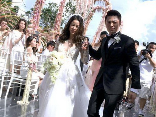 婚禮現(xiàn)場,林心如身穿白紗,披著一頭靚麗的秀發(fā),挽起霍建華的手,幸福甜蜜。
